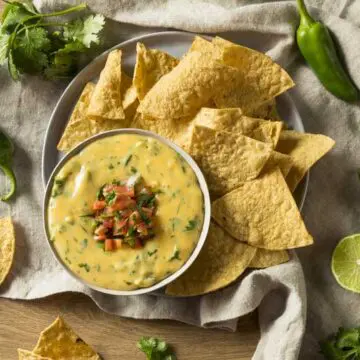 - After two hours your queso should be ready to go. We like to transfer it from the cooking pan into a slow cooker, on low, for serving purposes. This makes it possible to keep your queso warm and creamy. You can put the queso into smaller bowls for table serving.