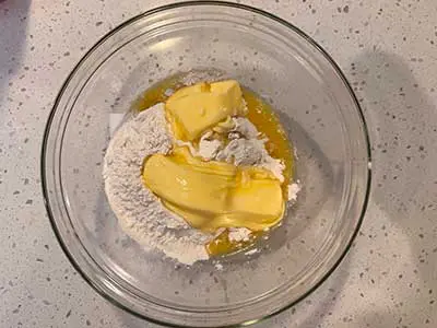 - In a large mixing bowl, mix flour and butter together with your fingers until the mixture resembles fine breadcrumbs