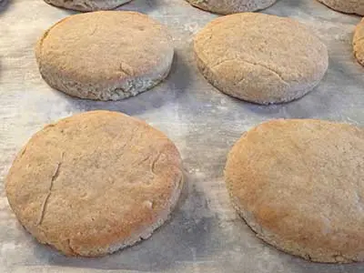Roll out your dough to a thickness of ½ to ¾ inch. Use a cookie cutter to press out your scone circles. Make sure you dust the cutter well to prevent any sticking.
